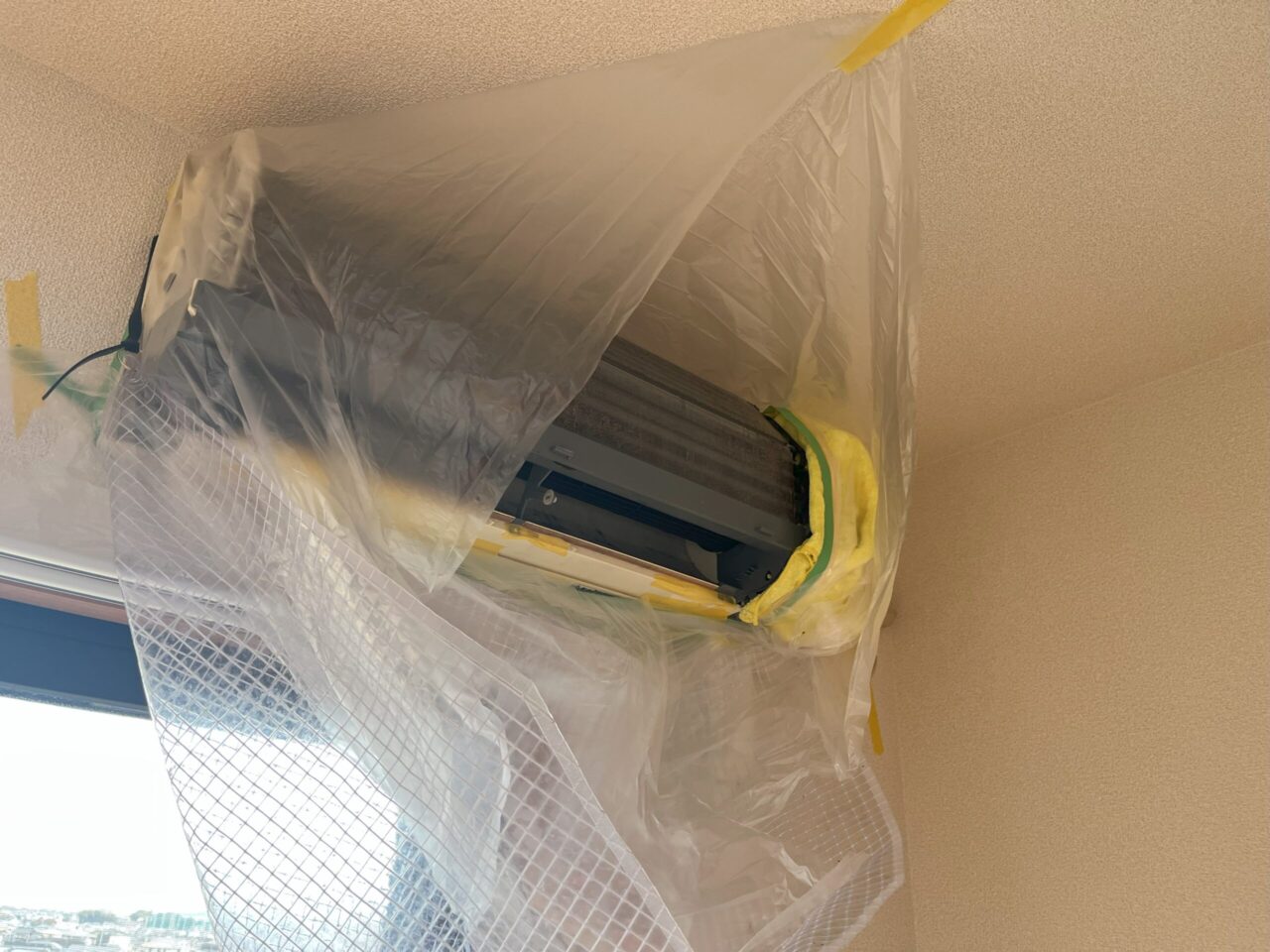 完全に壁からエアコンを外して、業者さんの事務所などで完全に分解してクリーニングして後日取り付けます。